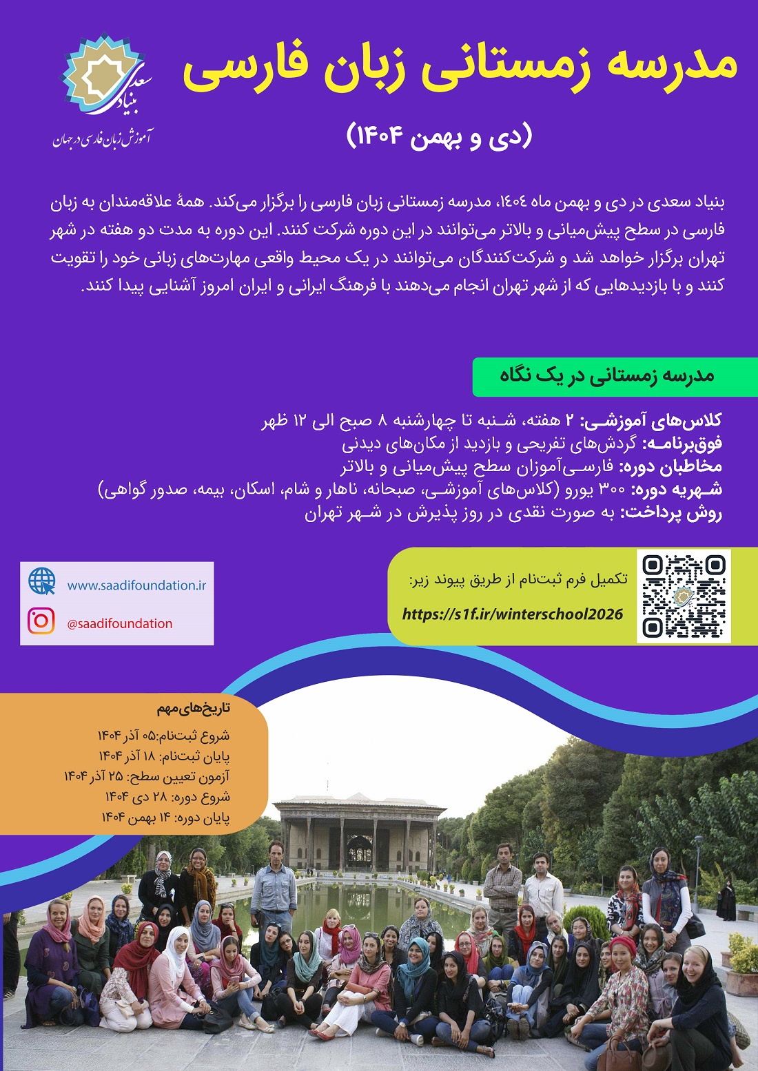 بنیاد سعدی در دی و بهمن 1404 مدرسه زمستانی زبان فارسی برگزار میکند. همه علاقمندان به زبان فارسی در سطح پیش میانی و بالاتر میتوانند در این دوره شرکت کنند. جهت تکمیل فرم ثبت نام لطفا به پیوند زیر مراجعه کنید.