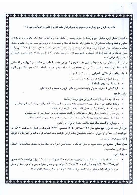 اطلاعیه و فرآیند نحوه پذیرش حج تمتع 1405 ویژه هموطنان مقیم خارج از کشور